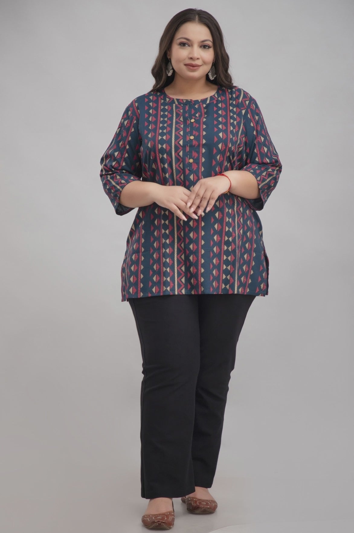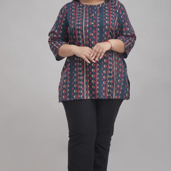 A beautiful blend of comfort and chic, this dark green rayon short kurti with subtle blue tones brings out the best in every curve. The geometric red-and-gold print and wooden buttons add a sophisticated ethnic touch perfect for everyday wear.
